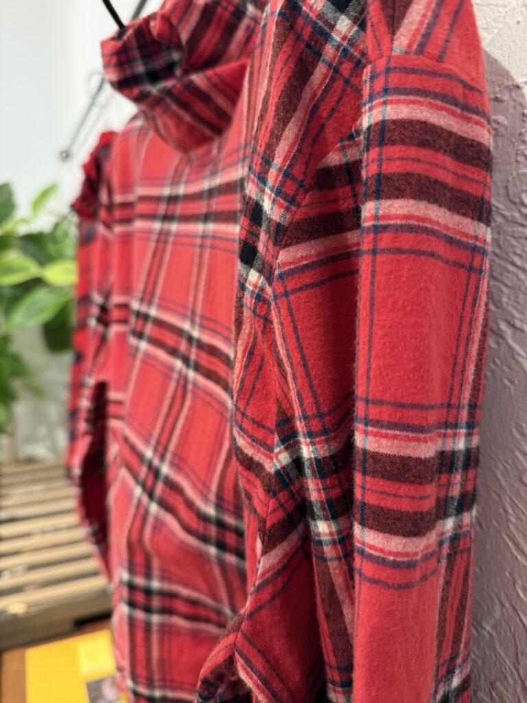 ブラウンの綿ツイードのジャケットに赤のチェックのボウタイブラウスも良いかも、、、