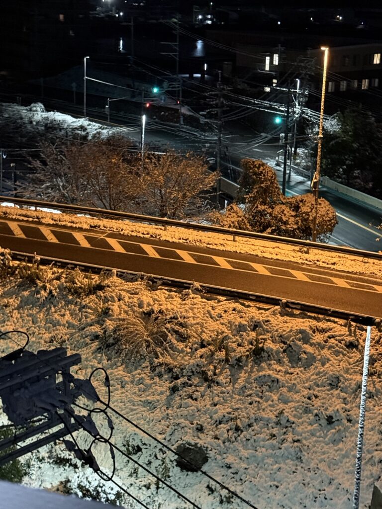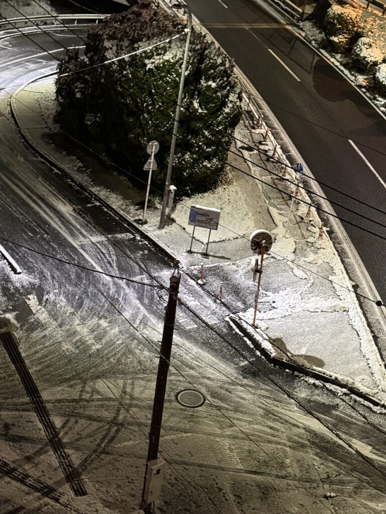 うっすら積もった雪は凍っています。自宅前は坂なので、午後からでしか外出は無理かと、、、