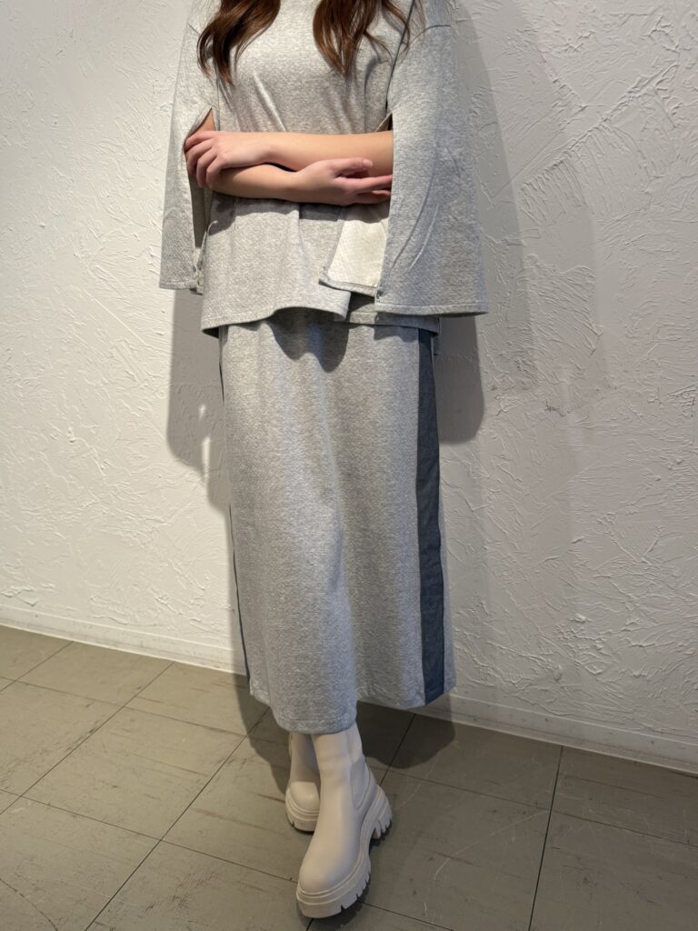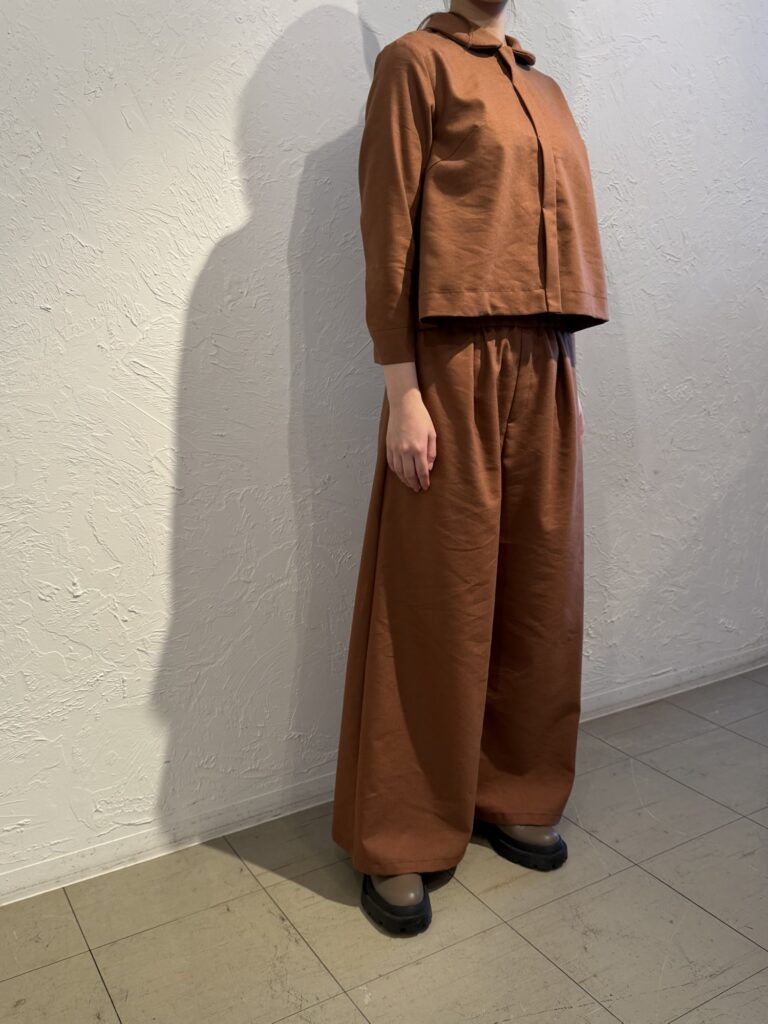 タックをランダムに重ねたスカートです。パンツ党の方でも履いてみたくなるようなスカートです。