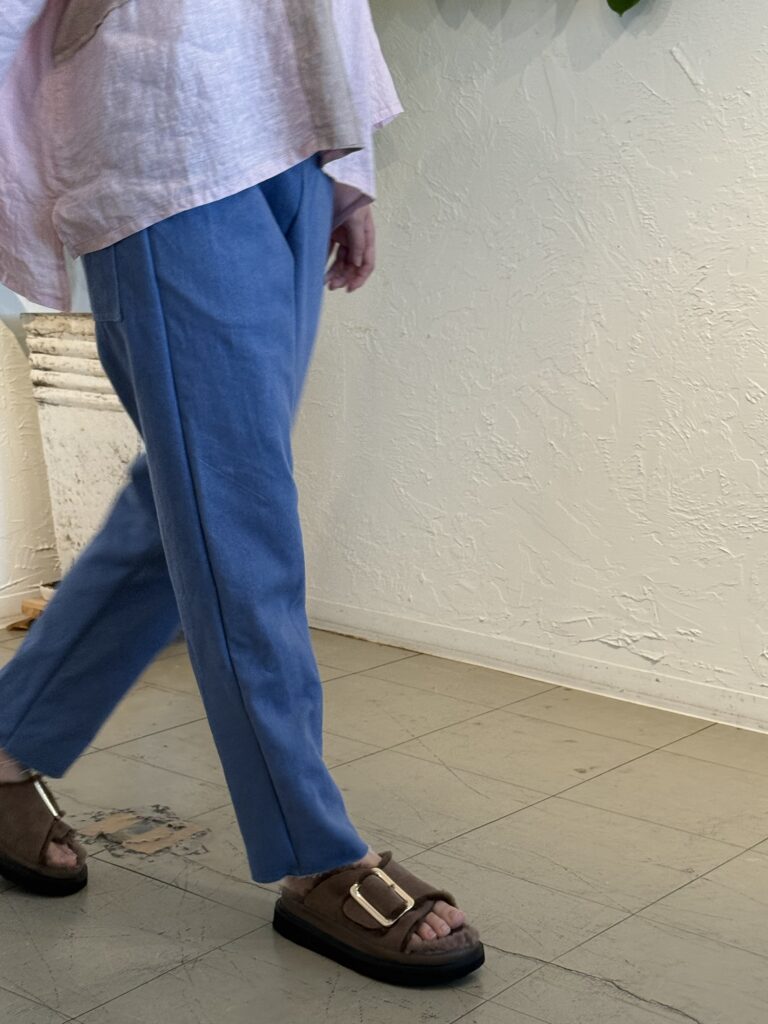 水色デニム麻混紡素材のワタシャンパンツです。