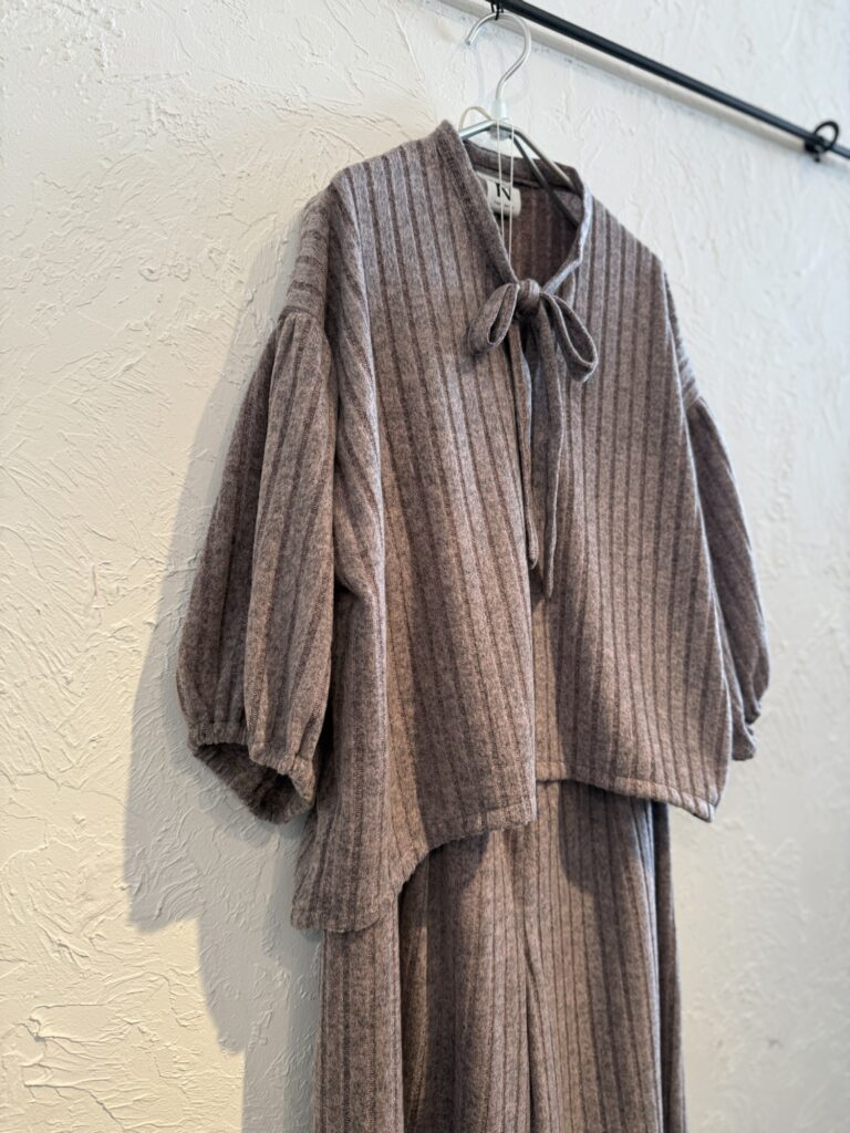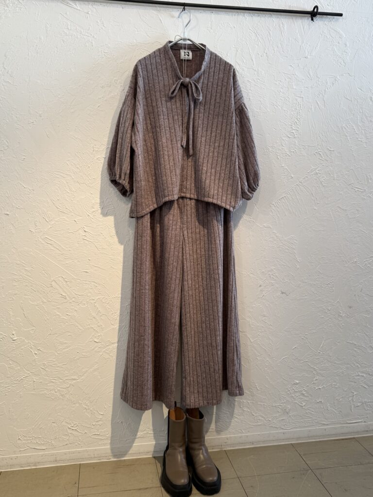 ニット素材のセットアップ。中間色の上品なセットアップです。新年会等にきていけるものです。年の始まりにぜひどうぞ!ピンク系とグリーン系がございます。